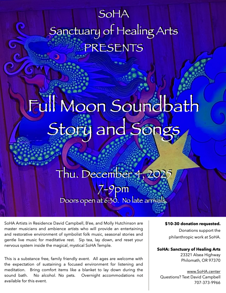 SoHA is a community-supported sanctuary on 142 acres of vibrant rainforest and mystical meadows. We offer workshops, concerts, retreats, and year-round gatherings — brought to life by the hands and hearts of the people who gather here.
